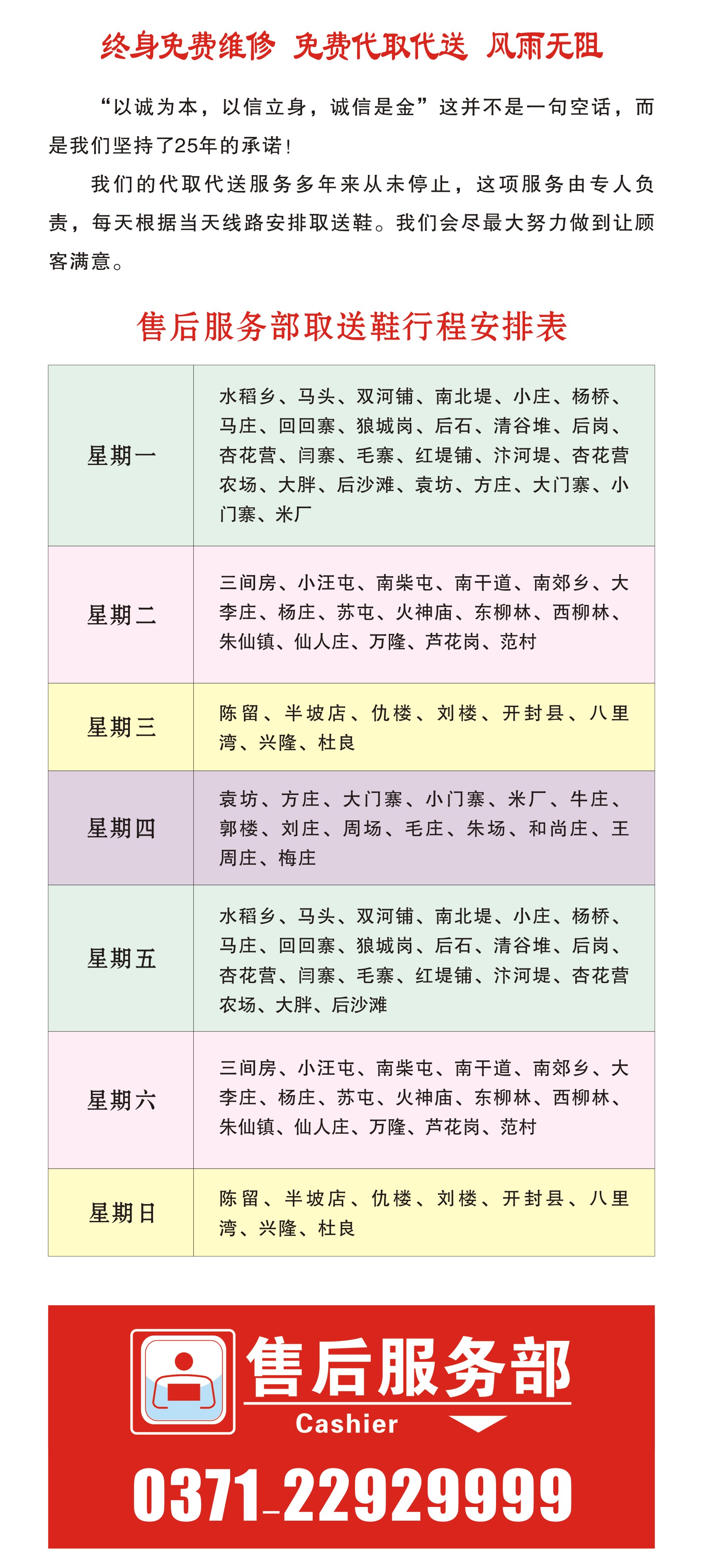 售后服务部取送鞋行程安排